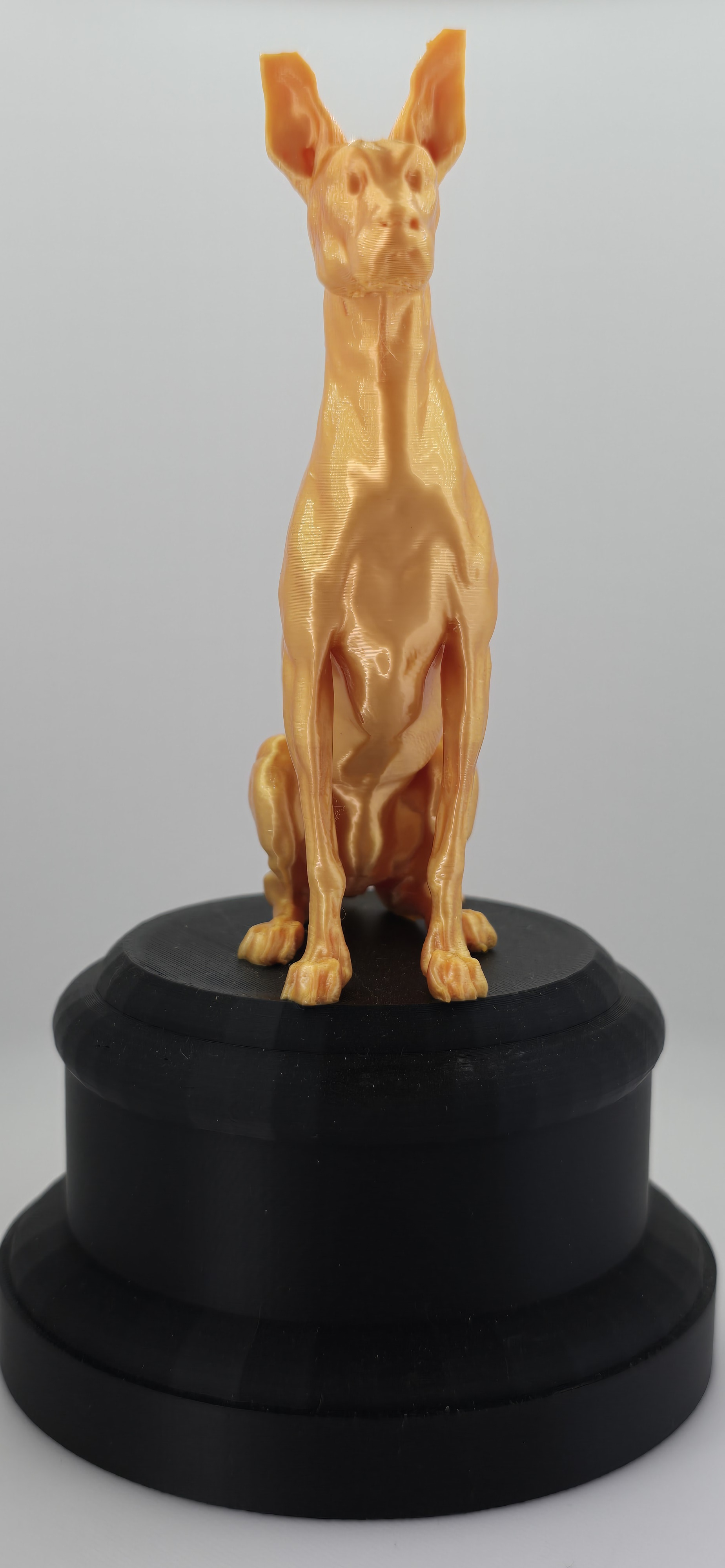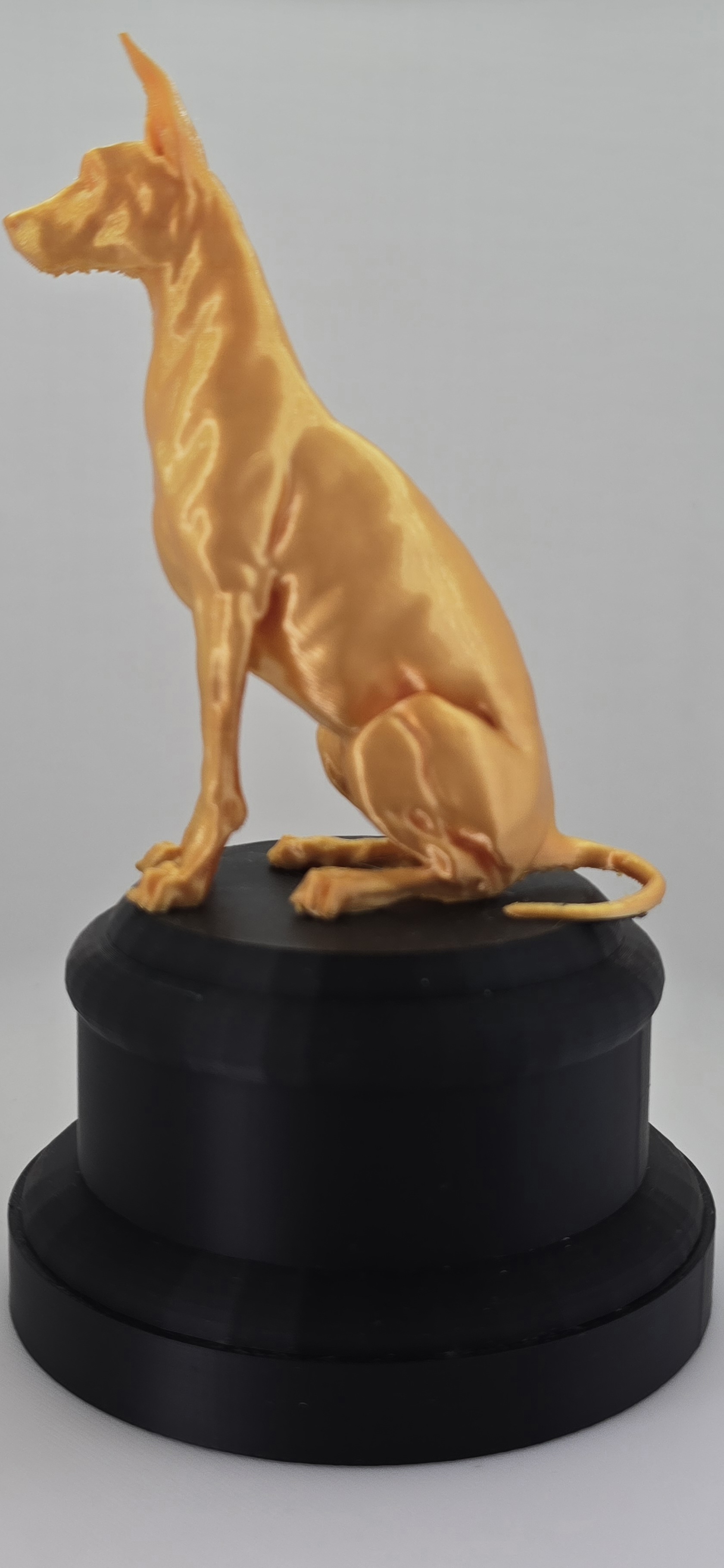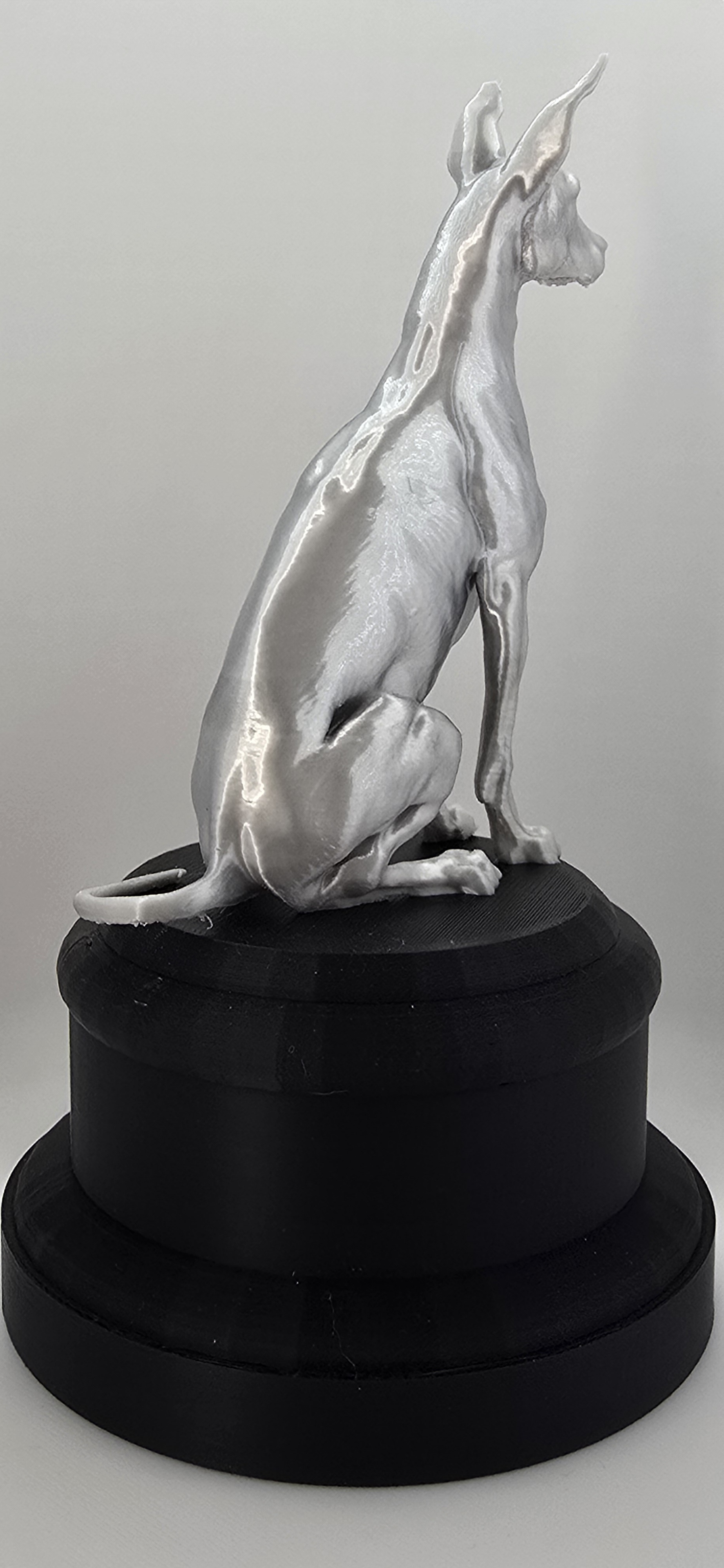 Oscar is geen gewone hond. Dit prachtig gedetailleerde 3D-geprinte beeldje straalt karakter en elegantie uit. Met zijn gespierde houding, gespitste oren en doordringende blik lijkt hij recht je ziel in te kijken. Of hij nu op je bureau staat of in je woonkamer pronkt – Oscar trekt gegarandeerd de aandacht.